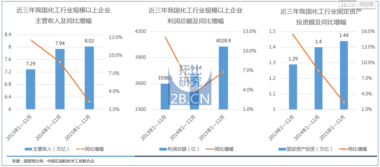 1.1宏观环境分析 从2011年开始我国GDP的增长速度在世界GDP增速逐渐放缓同时也呈现出了持续下行的趋势,2015年,我国GDP增速为6.9%,是自1990年以来首次跌破7%的年份。从GDP增速指标来看,我国的经济运行开始放缓。2015年作为我国“十二五”与“十三五”的交接年,预示着我国经济将会在“十三五”期间面临“转型、升级、改造”的攻坚阶段,经济的整个增速也会从高速增长过渡到中高速甚至中速阶段。 图1.1:中国GDP与工业增加值增长速度 据国家统计局公布的数据,2013年全国规模以上工业增加值(以下均按可比价格计算)比上年增长9.7%,2014年全国规模以上工业增加值(按可比价格计算)比上年增长8.3%,2015年全国规模以上工业增加值比上年增长6.1%(低于2015年度国内GDP6.9%的增速)。从数据来看,我国工业增加值在国内、国际GDP增速双重放缓的经济下行压力下直接呈现出了一路下滑的趋势。 化工业作为我国工业领域中最重要、最基础的行业在工业增加值快速下降、全国经济减速换挡、全国重工业产能普遍结构性过剩的三重压力下,也首次迎来了以“调结构、减产能、创新能源发展”为趋势导向的前所未有的转型压力。 1.2化工行业运行情况 图1.2:近三年我国化工行业主要经济指标运行情况 在整个国民经济、产业运行环境持续下行的压力下,我国化工行业在主营收入、利润总额以及投资额度分别遭遇了不同程度的增幅下降。从化工行业规模以上企业的主营收入上来看,从2013年7.29万亿元人民币增长到2015年8.02万亿元人民币,我国化工市场的规模已经突破了8万亿,但同比增幅从2013年的12.6%下降到了2015年的2.3%,累积下降了超过10个百分点;从我国化工行业规模以上的企业利润收入来看,从2013年的年利润总额3598.5亿元上涨到了2015年的年利润总额4028.9亿元,同比增长从2013年的12.1%下降到了2015年的6.8%,累积下降超过5个百分点,利润总额虽有所上升但同比增速的下滑现状说明了我国化工市场企业遇到 |