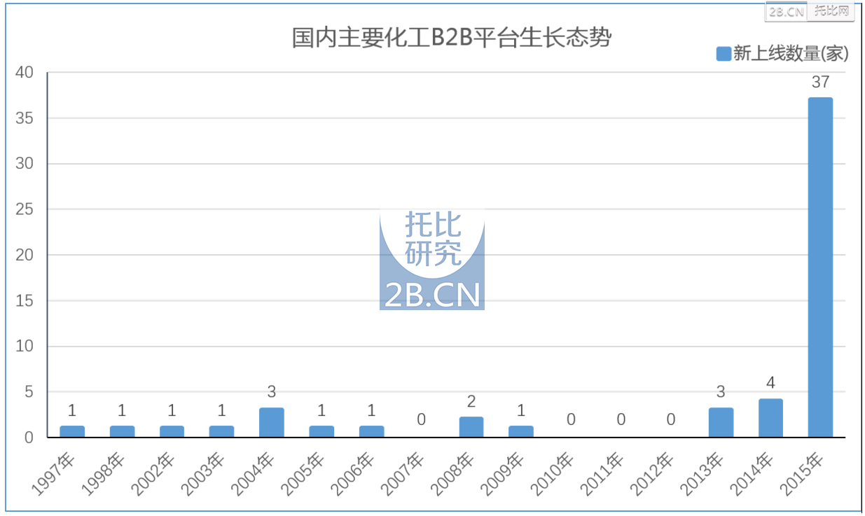 2.1我国化工B2B电商平台生长概况 据托比研究企业库不完全统计,我国化工B2B主要电商平台已接近60家,由《图2.1:我国主要化工B2B电商平台生长态势》得知,2015年全年新上线的化工B2B平台数量37家,远远超于过去十余年(1997年——2014年)我国化工B2B平台累积出现的总数量。2015年成为了我国化工B2B电商平台的爆发年。 图2.1:我国主要化工B2B电商平台生长态势 在刚刚过去的2016年上半年中,新上线的化工B2B电商平台的数量仅为七家,分别是大油桶石油网购商城,搜油网,买塑网,找化客,易塑家,找化网,东方易塑。从数量上来看,与2015年上半年同比增长-46.2%,出现了大幅下跌,预计2016年全年我国化工B2B电商平台数量保持在13家左右,在未来十年发展中,我国化工B2B平台逐年新上线的发展速度也会出现持续下跌直至稳定在年上线数量3到8家左右。 据托比研究企业库录入的56家化工B2B电商企业资料得知,我国化工行业B2B的网站最早可以追溯到中国化工信息网与中国化工网,其中中国化工信息网作为中国化工信息中心(1992年成立)旗下的网站之一,自1997年开始正式在互联网上提供服务,开拓了网络化工的先河,也是全国第一个介入行业网站服务的国有机构。中国化工网中文版成立于1998年,2004年更名为浙江网盛科技股份有限公司,并于2006年正式A股上市,成为“中国互联网第一股”,后来2002年出现的隆众石化、2003年广州塑料交易所、2004年卓创资讯、金银岛、上海化交、2005年中塑在线、2006年天天化工网、2008年网化商城和陶塑网、2009年我的塑料网等化工B2B电商平台的相继埋下了我国化工B2B成长的种子,这段时期中国B2B整体的行业还处在1.0时代,这类化工网站最初上线的时候主要是以提供化工产业界的资讯信息为主,个别平台会伴随撮合性的交易业务;此后在2010年、2011年、2012年我国化工B2B电商平台的成长又陷入了一片沉寂之中,直到2013年、2014年的时候,我国化工B2B平台的整体增速相比之前来讲稳定在200%的速度,此阶段伴随着我国B2B行业进入2.0交易时代,新上线的化工B2B平台交易属性远远大于媒体属性,比如2013年上线以化学品交易切入的摩贝,2 |