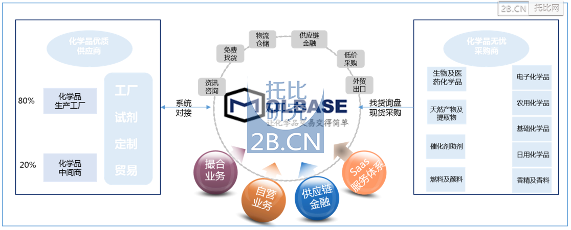 图3.3:摩贝运营模式 从2011年成立至今,摩贝网持续进化该平台的核心竞争力之一,同时也是其提供增值服务的重要依托——化合物数据管理系统,该系统为摩贝以第三方平台方式切入化学品电商交易提供了强有力的数据支撑工作。作为一家以化合物数据管理系统起家的化学品B2B电商综合服务平台,其发展的路径大致可以分为以下四步:第一步流量导入,第二步平台开放,第三步商城自营,最后也就是正在发展的综合性化学品B2B电商交易平台,以致未来发展成生态型的化学品交易的B2B平台。 作为化学品B2B交易平台,摩贝网的主营产品大致分为大宗化学品、精细化学品、研发化合物几个大类,开放平台、商城自营、供应链金融和SaaS服务体系,共同打造了摩贝网的核心竞争力,满足平台上下游化学品企业的综合需求。平台上入驻的供应商主要分为两大类,化学品的生产工厂和有服务能力的传统化学品中间商,二者占比为8:2,下游主要是化学品采购商。采购商通过“找货询盘、现货采购”等方式在平台上进行化学品的采购资讯、找货、下单交易等行为,平台会自动精准匹配到合适的上游卖家去链接二者的交易。其中,在交易过程中推出了供应链服务。该业务根据买卖双方在交易过程中的各个环节需求推出了不同的服务版块比如有“订易通”“仓融通”“赊销通”等,解决了交易账期、存货风险、资金流转等问题。 托比研究认为,化合物百科数据库,担保支付、仓储物流、供应链金融、SaaS服务以及强劲的商务和运营能力,这些综合因素构成摩贝作为化学品B2B电商平台的强势壁垒。在2015年,平台上的流量接近200亿。可以说,摩贝正是有了完整的数据库和创新的商业运作模式,才迎来了资本机构对其相继青睐。 以下是摩贝融资状况: 图3.4:摩贝融资状况 3.3网化商城 2008年9月,网化商城前身上海易势化学技术有限公司成立, |