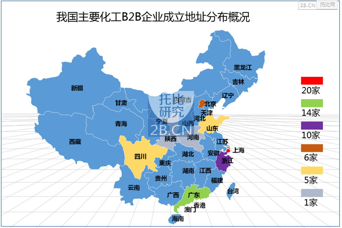 托比研究认为,从历时的角度来看,我国化工B2B电商平台依次经历了:1997年到2009年的萌芽期,这些平台主要是以发布化工业界的信息及咨询为主并伴有撮合交易的存在,2010年到2012年的沉寂期、2013年到2014年的成长期,此阶段与我国粗放型产业整体在2013年前后开始遭遇产能过剩、环境污染等因素下国家政策导向有关,并在此导向下以大宗产业钢铁B2B电商找钢网成功嫁接互联网技术并实现的资本市场分外青睐等因素为例成功助推了我国化工行业互联网产业转型风尚;之后我国化工B2B平台的在2015年成为了爆发期、以及未来的理性调整期。 从2013年的化工B2B进入交易2.0时代到近两年的增长趋势,可以预测我国化工B2B平台将会经历“急剧上涨”与“断崖下跌”的“倒V”字形成长图景,一方面说明,我国化工B2B平台扎堆式、高集中度的发展的确是受到了我国整个传统化工产业在互联网时代转型的压力和自寻出路的动力,另一方面也看到了作为产业与商业的相互结合体在遵循优胜劣汰的市场发展规律下,最终发展会在资本市场与商业运作的双重参与下走向理性发展与良性竞争的局面。 2.2我国化工B2B电商平台创业地图 现阶段我国化工B2B平台在地域分布上多集中在在上海、广东、江浙一带。其中上海地区出现20家化工B2B电商企业,成为最多的化工B2B电商企业的生存地,其次紧跟其后的是广东一带,出现14家企业,占据了四分之一的份额,排名第三的是江浙一带。除此之外,我国化工B2B企业的生存地在北京、四川、陕西、河南等地区均有出现。 图2.2:我国主要化工B2B电商平台成立地址 从地理位置来讲,我国的化工B2B企业主要生存在东部沿海地区。东部沿海作为我国化工产业的集聚地为化工B2B企业的成立提供了地理位置上的天然优势,这些新成立的企业就地使用成熟的化工资源(比如原料的供应、人才的调用等),并且由于靠近沿海地区可以使用轮渡运输减少了运输成本的同时也降低了化工品的危险运输系数,最终降低了交易成本,这一逻辑也符合了B2B电商平台的降本增效的逻辑。 除此之外,我国化工B2B电商平台也存在陕西、河南、四川、山东、北京等中部以及中西部地区,之所以会出现这种状况,造成这一现象的根本原因,也与我国整个大的环境发展有关,由于化工业主要以石油等能源型材料为主要生产原料进行加工,会伴随着大量的高污染副产品的排放 |